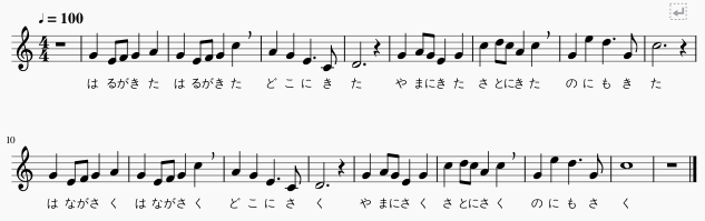 MusicXML 포맷의 악보를 MuseScore를 통해 열면 기본적으로 위와 같은 모습입니다. 이제 각 음표에 히라가나로 가사를 작성해주면 됩니다. 음표를 클릭하고 Ctrl + L 단축키를 통해 음표에 해당하는 가사를 입력할 수 있습니다.