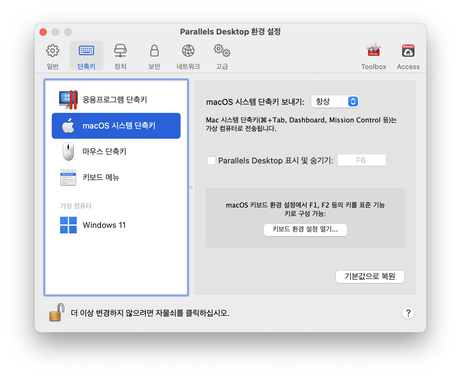 Parallels 한영 전환 맥과 동일하게 설정하기 본문